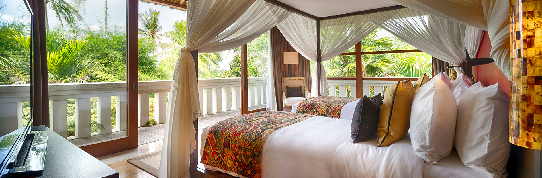 The villa’s fabulous rural rice-terrace setting, panoramic views, private multi-pavilion design, antiques-filled interiors, fascinating art collection and no-expense-spared facilities – including four pools, a tennis court, home theatre, games room, spa and gym – create an unmatched experience for up to 18 guests.